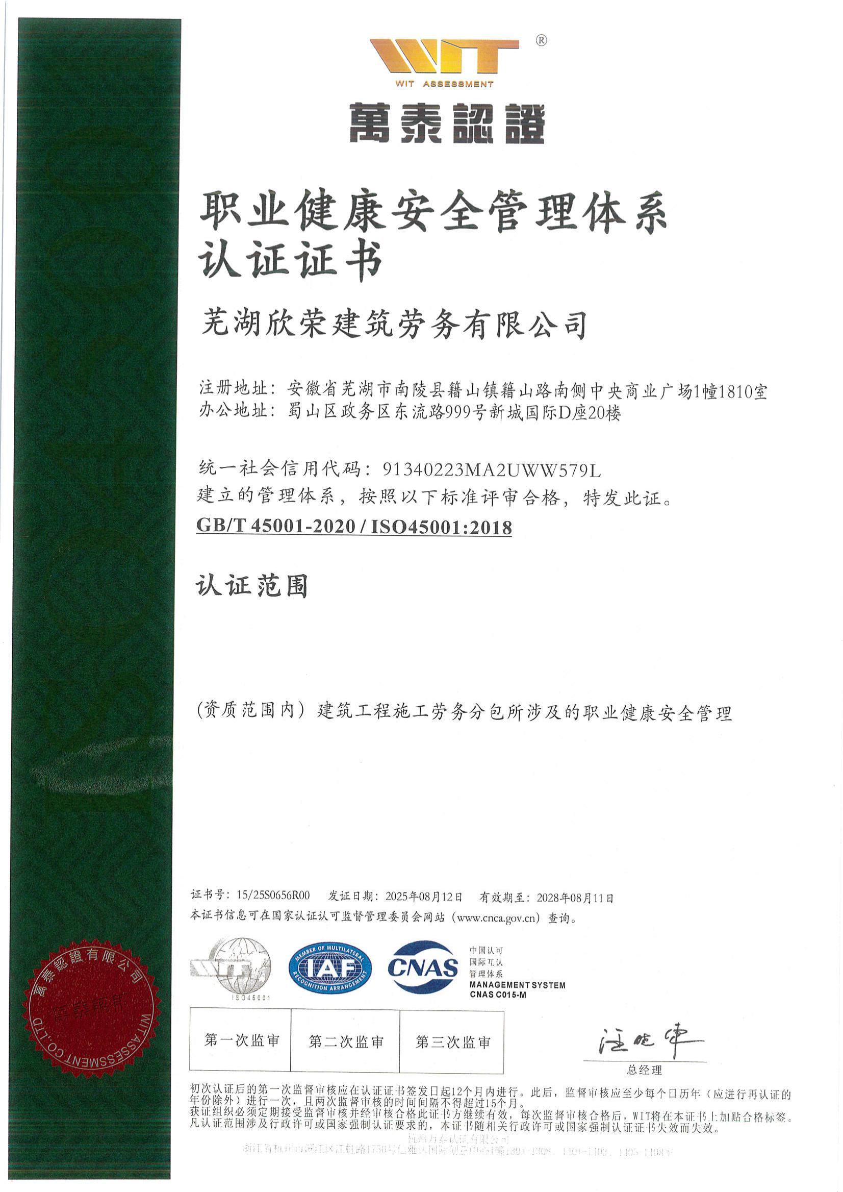 欣荣劳务获“职业健康安全管理体系认证”证书
